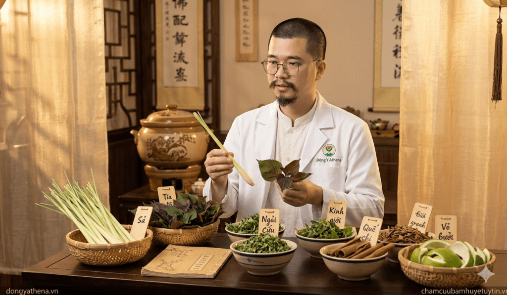 Thay vì dùng tinh dầu nhân tạo, chúng tôi sử dụng 100% thảo mộc tươi tuyển chọn: Lá sả, Hương nhu, Vỏ bưởi, Kinh giới, Tía tô, Ngải cứu, Quế chi… Mỗi nồi nước xông được phối trộn theo tỷ lệ “Quân – Thần – Tá – Sứ”. Các hoạt chất kháng sinh tự nhiên này giúp khu phong, tán hàn và thông kinh lạc cực mạnh.